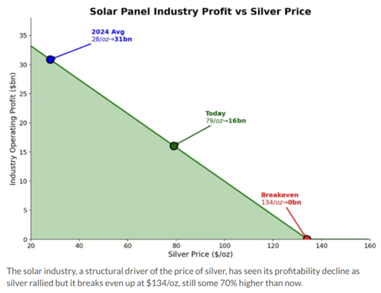 此外,他指出,作为白银的主要需求来源之一,太阳能行业在银价达到每盎司134美元时仍能实现盈亏平衡,这一价格较当前现货白银价格高出约70%。