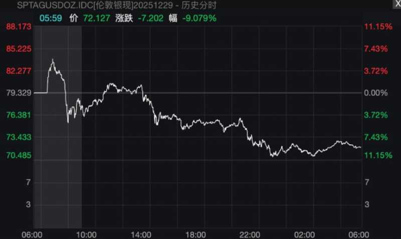 现货白银从周一早盘一度上涨近6%,最终跌超9%,创下自2020年9月以来最大的单日跌幅;现货黄金大跌超4%,创下自10月21日以来的最大单日跌幅,也是今年第二次出现如此幅度的单日暴跌;COMEX黄金期货大跌4.45%,报4350.2美元/盎司;COMEX白银期货暴跌7.2%,报71.64美元/盎司;现货钯金暴跌超15%,现货铂金暴跌超14%。