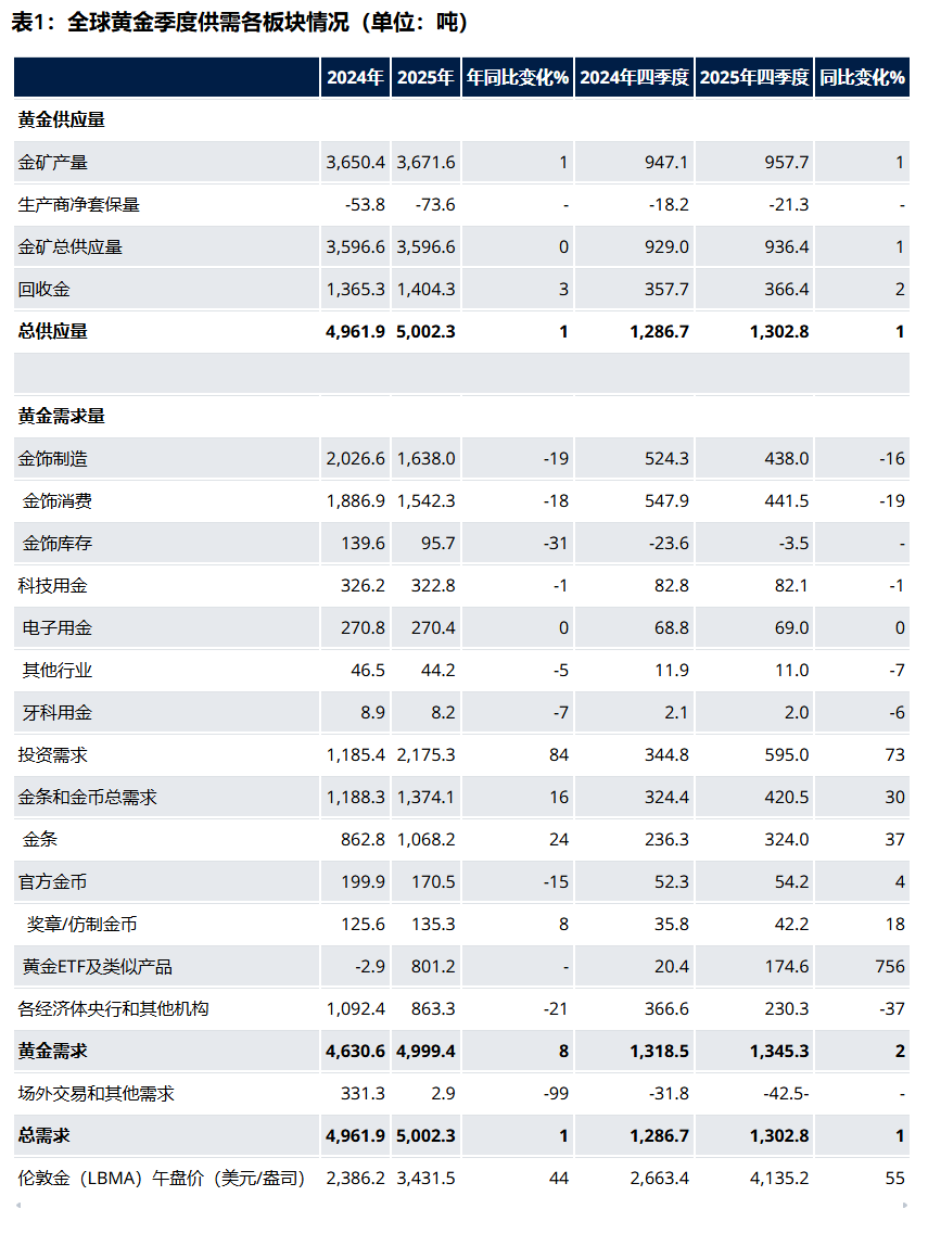 2025年见证了全球黄金需求的激增和金价的大幅飙升。持续的经济和地缘政治风险已成为‘新常态’,消费者和投资者纷纷买入并持有黄金。黄金投资需求成为全年焦点,投资者通过各种可用渠道争相配置黄金,而其他细分领域也对全球黄金需求发挥了支撑作用。美元金价较上年同比大涨67%,但金饰需求仅下降18%,说明消费者在高金价环境下仍愿意购入金饰产品;同时,全球央行也坚定致力于增加黄金储备。
