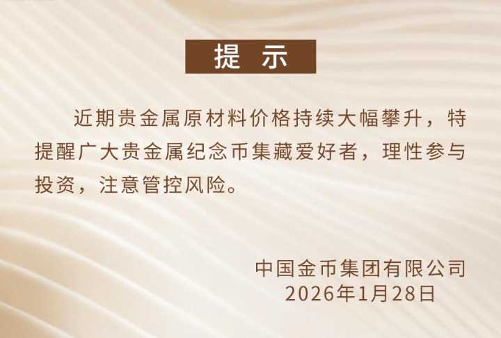 【大河财立方消息】1月28日,中国金币集团发布提示称,近期贵金属原材料价格持续大幅攀升,特提醒广大贵金属纪念币集藏爱好者,理性参与投资,注意管控风险。