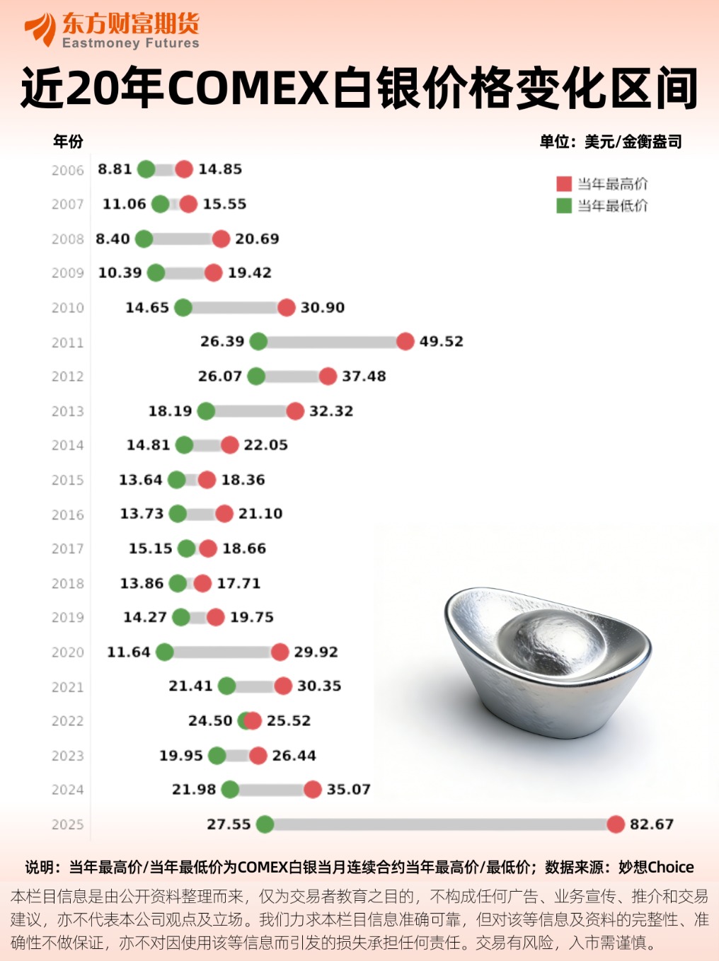 白银价格波动如何?近20年COMEX白银期货当月连续合约波动区间一览!