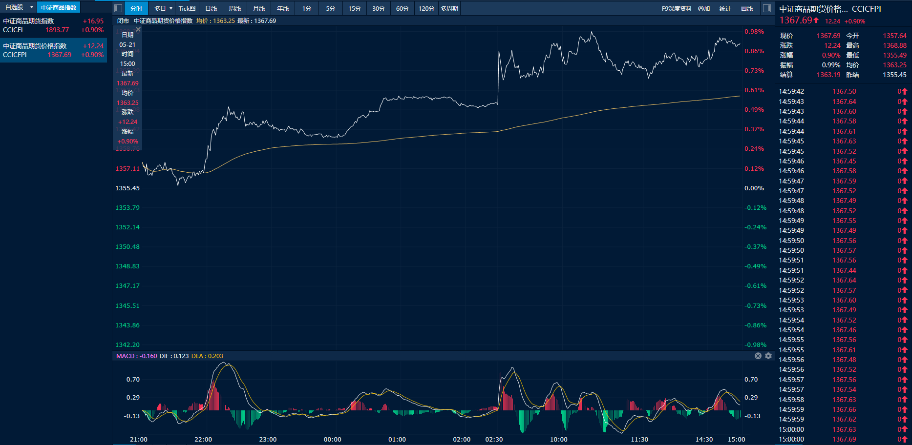 截至21日下午收盘,中证商品期货价格指数收报1367.69点,较前一交易日上涨12.24点,涨幅达到0.9%。同时,中证商品期货指数也收报1893.77点,较前一交易日上涨16.95点,同样涨幅0.9%。