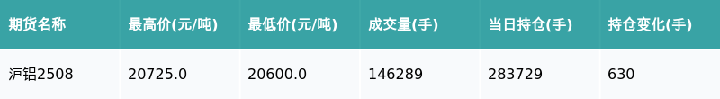 南财金融终端盘后期货数据显示,沪铝主力合约收涨0.36%,收盘报20635.0元/吨,日内资金流入1300.01万元,反映铝市短期活跃态势。