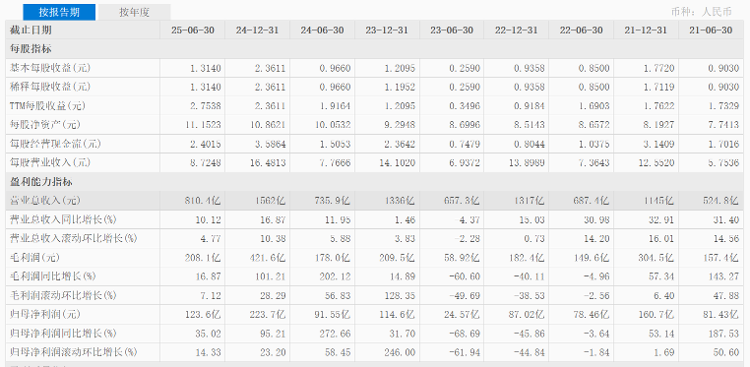 据2025年半年报显示,中国宏桥今年上半年收入、利润继续保持稳健增长,并双双创下同期历史新高。上半年,中国宏桥实现收入约810.4亿元,较上年同期的735.9亿元增长10.1%;公司实现归母净利润123.6亿元,较上年同期的91.6亿元同比大幅增长35%。公司每股基本盈利较上年同期增加约36%至1.314元。