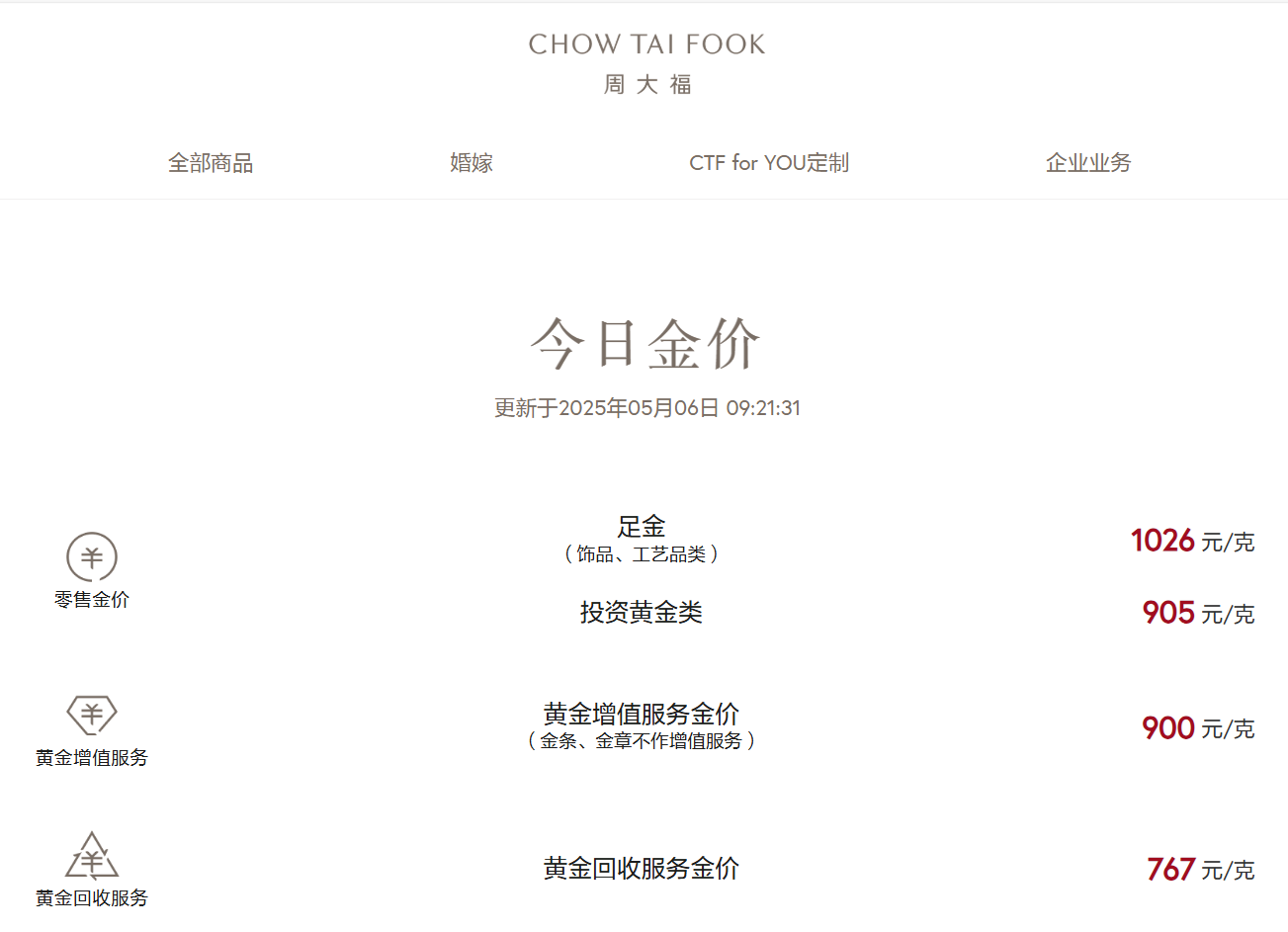 具体来看,周大福金饰价格为1026元/克,较前日上涨28元/克;周生生金饰价格为1023元/克,上涨23元/克;老庙黄金金饰价格为1022元/克,上涨31元/克;老凤祥足金饰品价格为1025元/克,上涨27元/克。