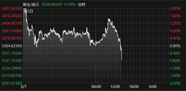 据Choice数据显示,国际现货黄金价格在5月8日午后持续下跌,市场情况令人瞩目。截至14:17,黄金报价达到3338美元/盎司,跌幅接近1%,这一波动引发了市场的广泛关注。