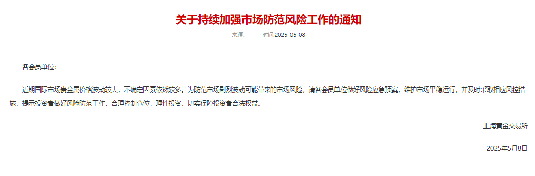 上海黄金交易所发布通知,近期国际市场贵金属价格波动较大,不确定因素依然较多。请各会员单位及时采取风控措施,提示投资者密切关注市场动态,做好风险防范与应对工作。