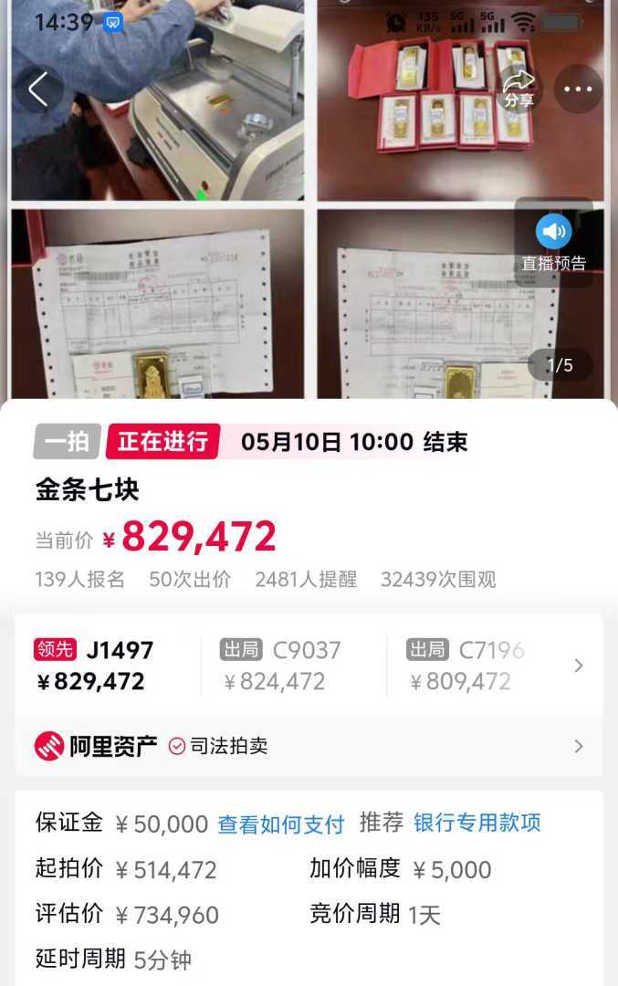 截至5月9日14时39分,共有139人报名参与竞拍,围观次数高达3.24万次,经过50次出价,拍卖价最终达到了82.95万元。据此计算,平均每克黄金的价格为829.47元。
