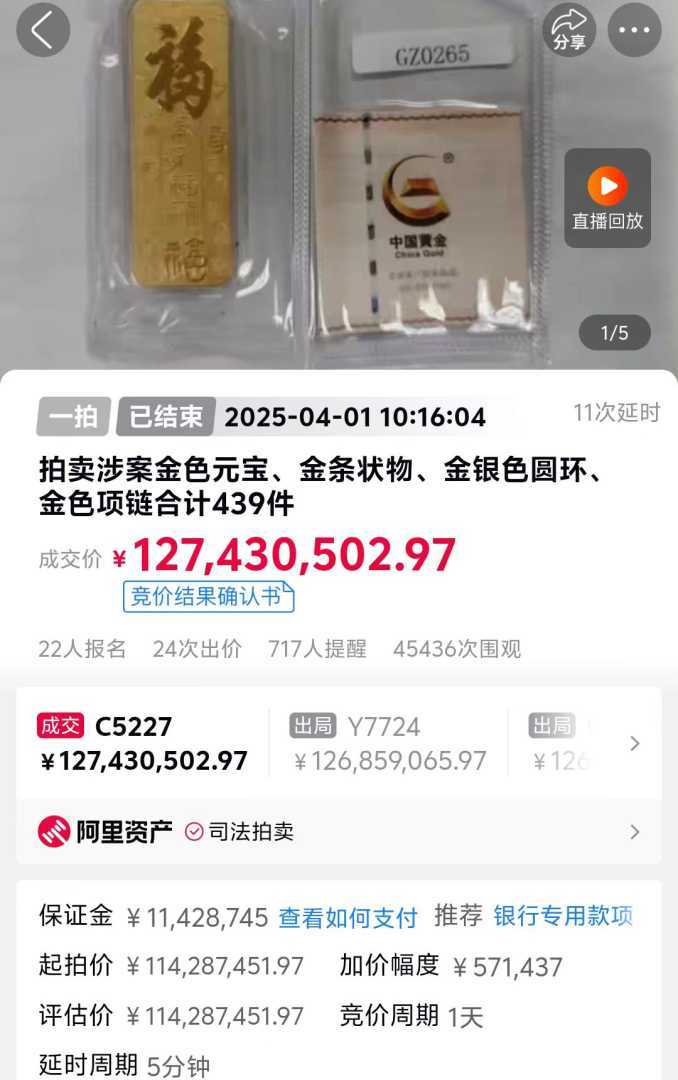 这批黄金饰品的竞拍门槛较高,竞拍者需缴纳约1143万元的保证金,并按约57万元的幅度加价。尽管如此,仍吸引了22人报名参与竞拍,围观次数达到4.54万次。经过24次出价,最终一位参与者以1.27亿元成功竞得这批黄金饰品。