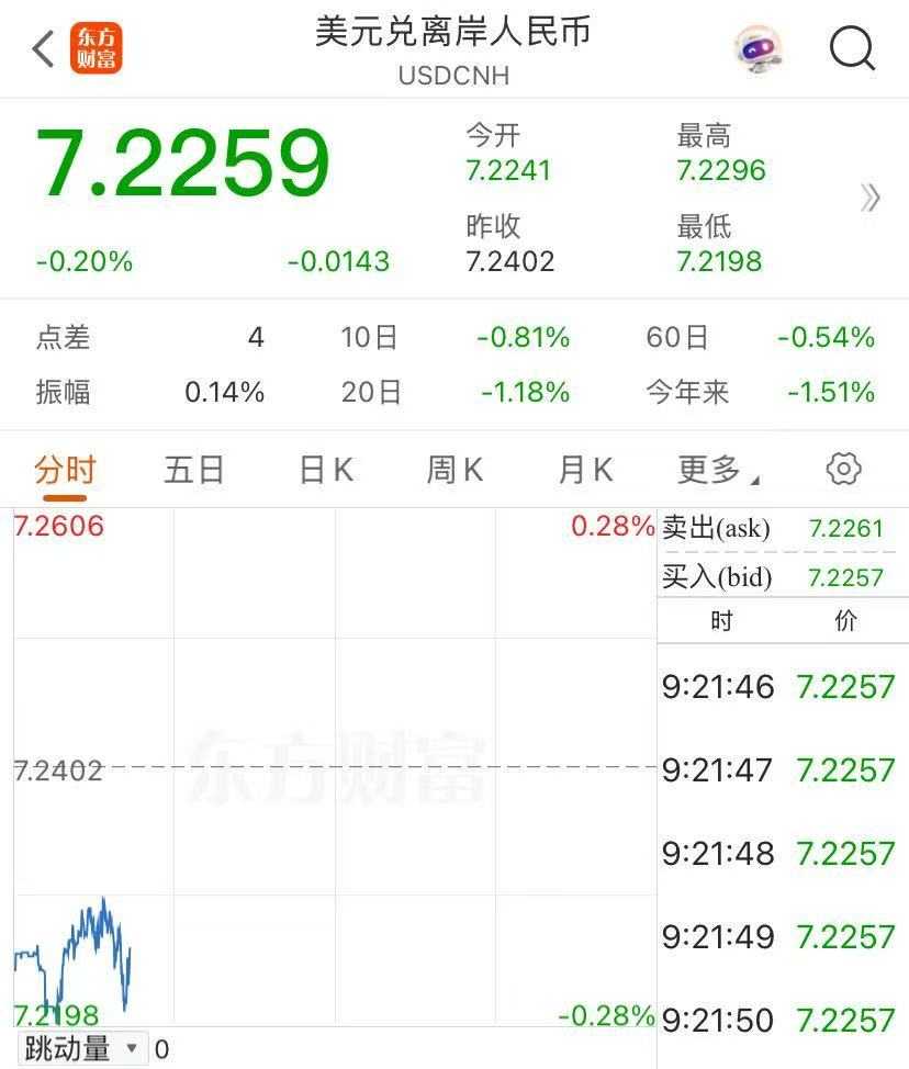 与此同时,北京时间周一,离岸人民币盘中突然拉升。美元对离岸人民币汇率一度跌逾200点,随后跌幅有所收窄,现报7.2259。