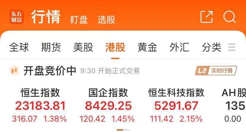 港股开盘,恒指开涨1.38%,科指开涨2.15%。科网股回暖,汽车股走高,蔚来汽车涨4%,阿里巴巴涨超2%。