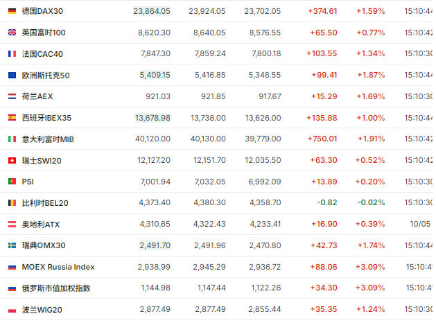 欧洲股市开盘后普遍上涨,斯托克50指数开盘涨1.7%,德国DAX指数涨1.5%,英国富时100指数涨0.8%,法国CAC 40指数涨1.2%。