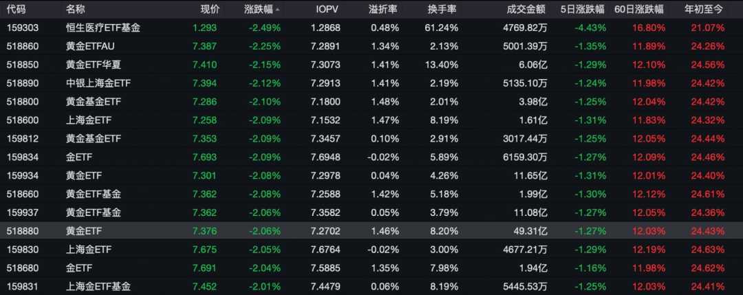 二级市场同步承压,黄金股普遍下跌。A股黄金珠宝板块当日低开低走,潮宏基跌幅4.41%,西部黄金、四川黄金跌幅超3%;港股市场表现更为惨烈,万国黄金集团、灵宝黄金、赤峰黄金跌幅超11%。黄金相关ETF纷纷回调,黄金ETF华夏(518850)、中银上海金ETF(518890)等多只黄金ETF跌逾2%。
