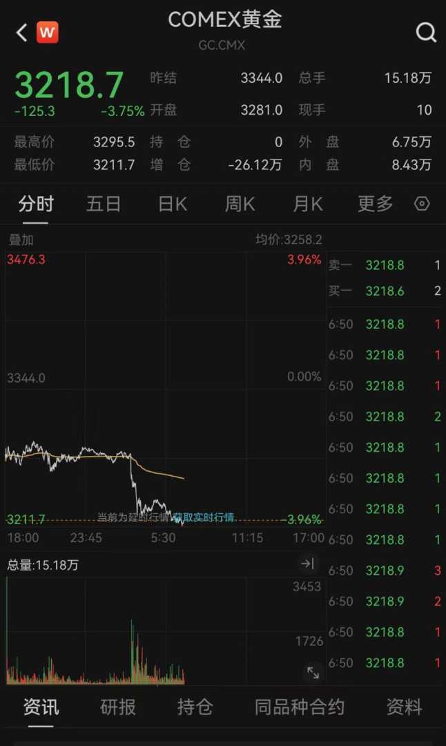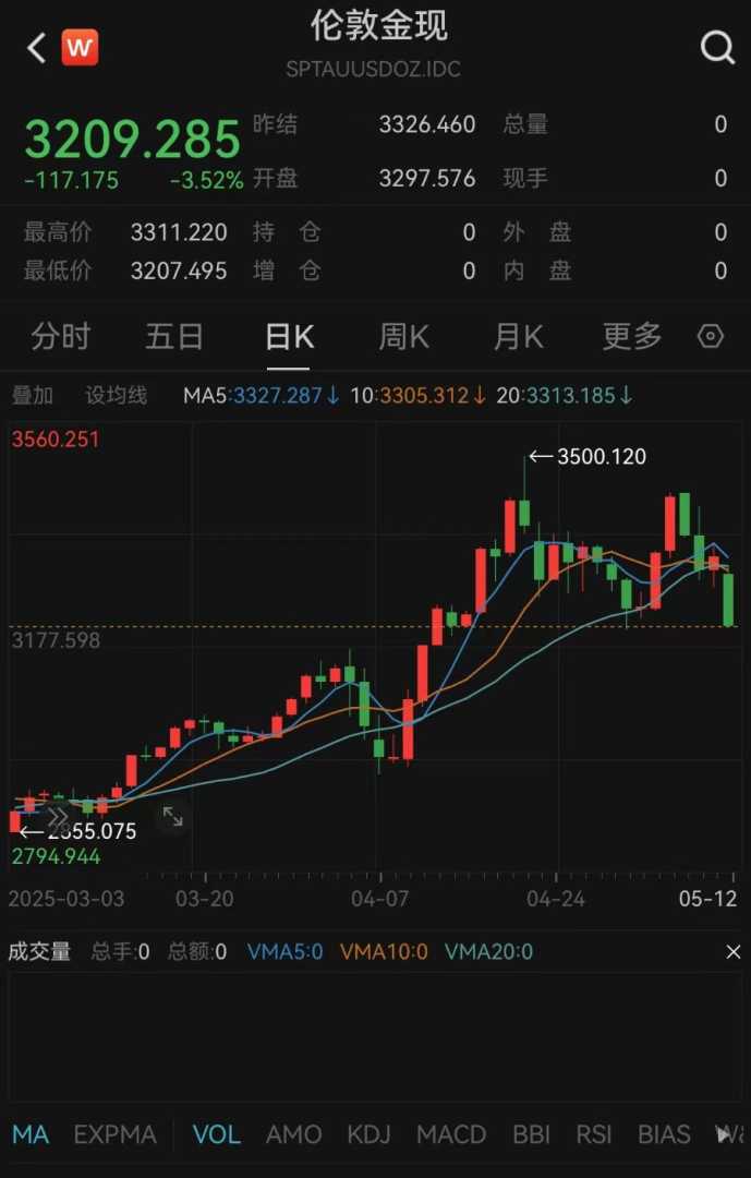 5月12日,国际黄金市场再现剧烈震荡,现货黄金跌破3210美元/盎司,为4月14日以来首次,最低触及3207.49美元/盎司。截至北京时间19:00,现货黄金报3209.28美元/盎司,跌幅扩大至3.52%;COMEX黄金主力合约同步下跌,报3218.7美元/盎司,跌3.75%。