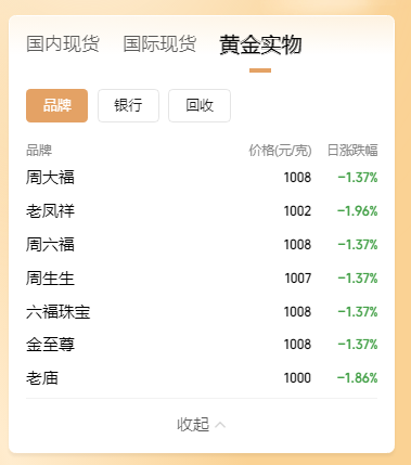 国内市场方面,金饰价格紧随国际金价波动,多个品牌金饰价格跌回千元附近。周大福金饰报价1008元/克,单日下跌1.37%;老凤祥金饰报价1002元/克,单日下跌1.96%;老庙黄金金饰报价1000元/克,单日下跌1.86%。
