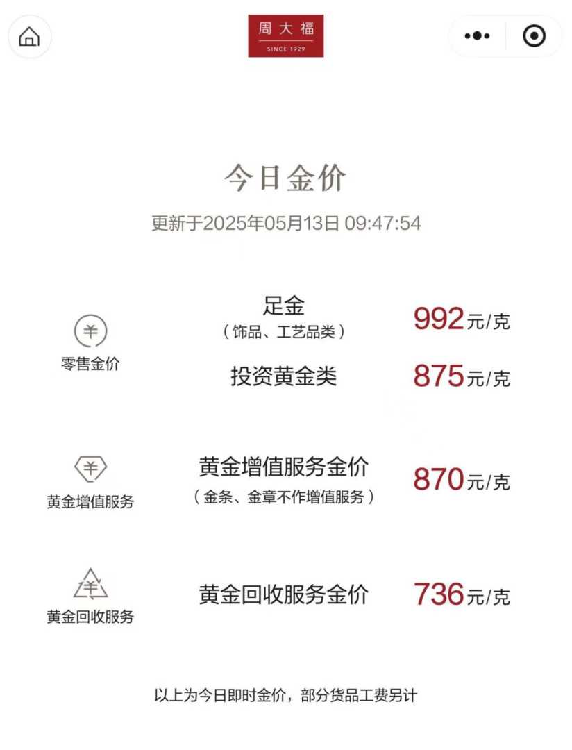 受国际金价回调影响,5月13日,国内多家品牌金店足金饰品报价下调至千元以下。以周大福为例,5月13日,周大福足金(饰品、工艺类)报价992元/克,投资黄金类报价875元/克,黄金回收服务金价为736元/克。这一变化引发了市场的广泛关注。