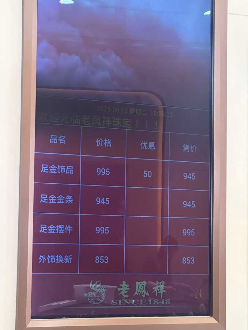 “最近几天金价回调,调整前报价曾达1050元/克,今天报价995元/克,每克优惠50元,优惠后报价945元/克。”老凤祥金店销售人员表示。
