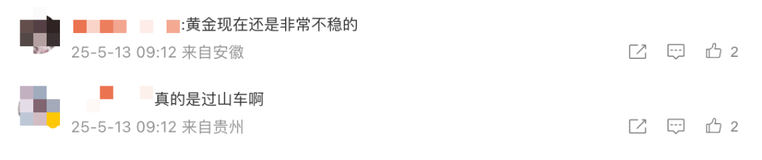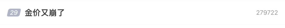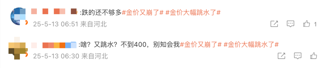 5月13日,“金价又崩了”话题登上微博热搜,引发广泛关注。有网友感叹目前金价“非常不稳定”,也有网友称“最近赔了不少”。