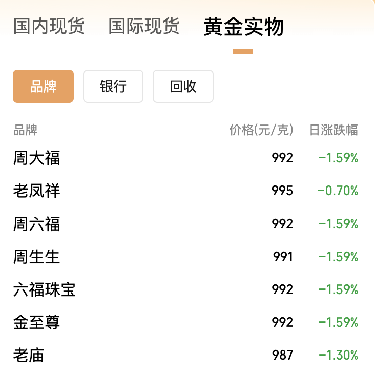 足金饰品价格近期波动剧烈,5月初曾普遍跌破1000元/克,但随后又涨回。5月13日,周大福、周六福等金店足金价格再次跌破千元大关,日跌幅达1.59%以上。