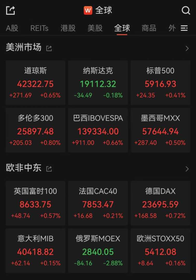 欧洲股市普遍上涨,美股三大指数低开高走。美股大型科技股多数下跌,亚马逊、META均跌逾2%。部分中概股表现亮眼,网易财报超预期,大涨逾14%。