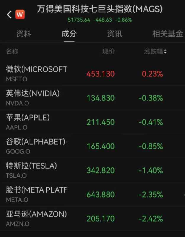 大型科技股多数下跌,万得美国科技七巨头指数下跌0.86%。亚马逊下跌2.42%,META下跌2.35%,特斯拉下跌1.40%,谷歌母公司Alphabet下跌0.85%,苹果下跌0.41%,英伟达下跌0.38%;仅微软上涨0.23%。