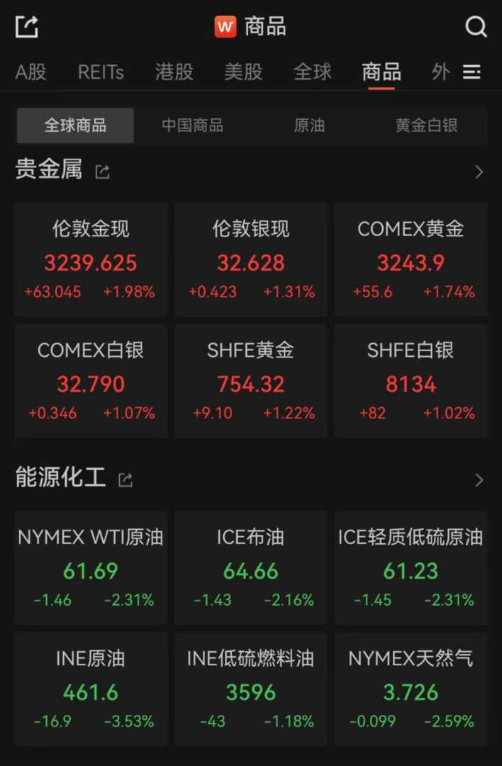 商品市场方面,国际贵金属普遍上涨。截至北京时间5月16日5:29,伦敦金现上涨1.98%,报3239.625美元/盎司;COMEX黄金上涨1.74%,报3243.9美元/盎司。伦敦银现上涨1.31%,COMEX白银上涨1.07%。