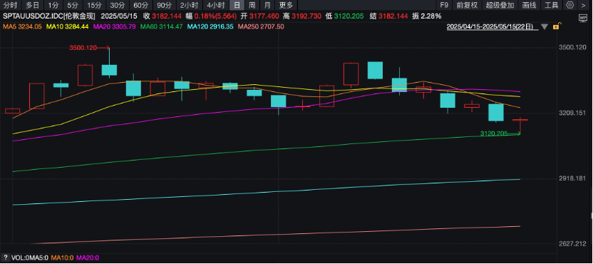 近期,中美关税战告一段落,市场避险情绪明显消退,受此影响,黄金价格连续跌破3300美元和3200美元的重要关口。5月15日,国际金价更是最低触及3120美元/盎司,从前期3500美元的高点回调近380美元,这一现象引发了市场的广泛关注。