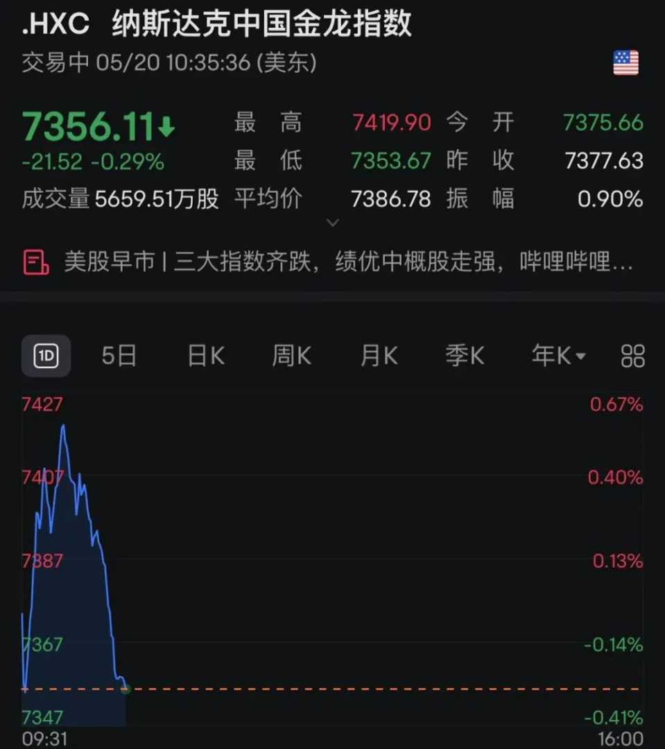 中概股方面,纳斯达克中国金龙指数一度翻红,但随后迅速下跌,截至发稿时跌幅超过0.2%。