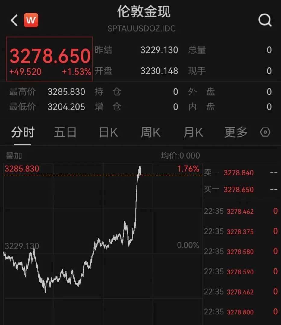 黄金价格则突然暴涨,截至发稿时,现货黄金涨幅已超过1%,价格涨至3276美元附近。