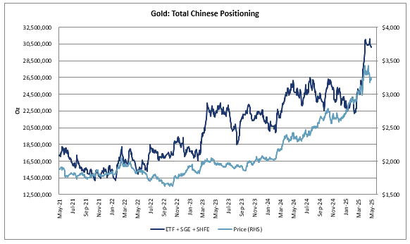 在上周跌至略高于3100美元的低位后,本周受中东地缘紧张局势升级及穆迪下调美国Aaa主权信用评级的双重影响,国际金价再次强势反弹,隔夜已回升至3300美元整数大关上方。这一反弹趋势背后,高盛FICC分析师Adam Gillard指出,中国买盘力量正再度回归,为金价提供了有力支撑。