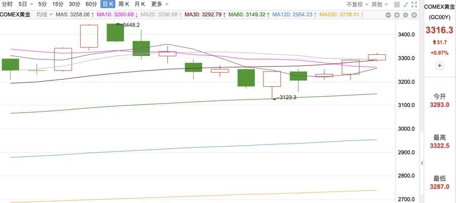 截至5月21日15点,COMEX黄金价格仍稳稳站在3300美元/盎司上方。