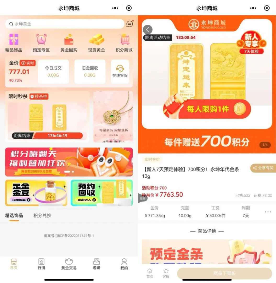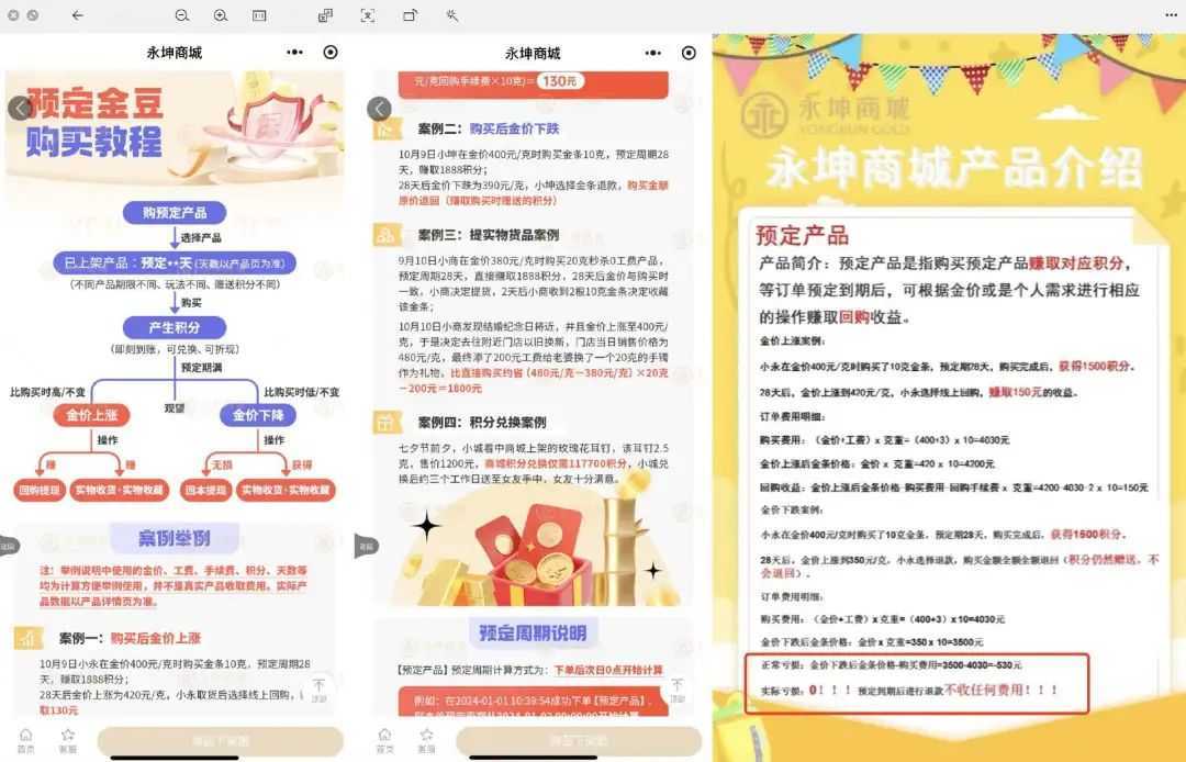 多位投资者称,本月20号左右发现永坤兑付异常,黄金产品收益迟迟未到。在永坤黄金线上商城,客户可以大盘金价“预定黄金”,周期从3-88天不等,到期后用户可选择回购提现或收下实物。即便金价下跌,购买金额也能原价退回,还有积分兑换礼品等福利,听起来似乎稳赚不赔。