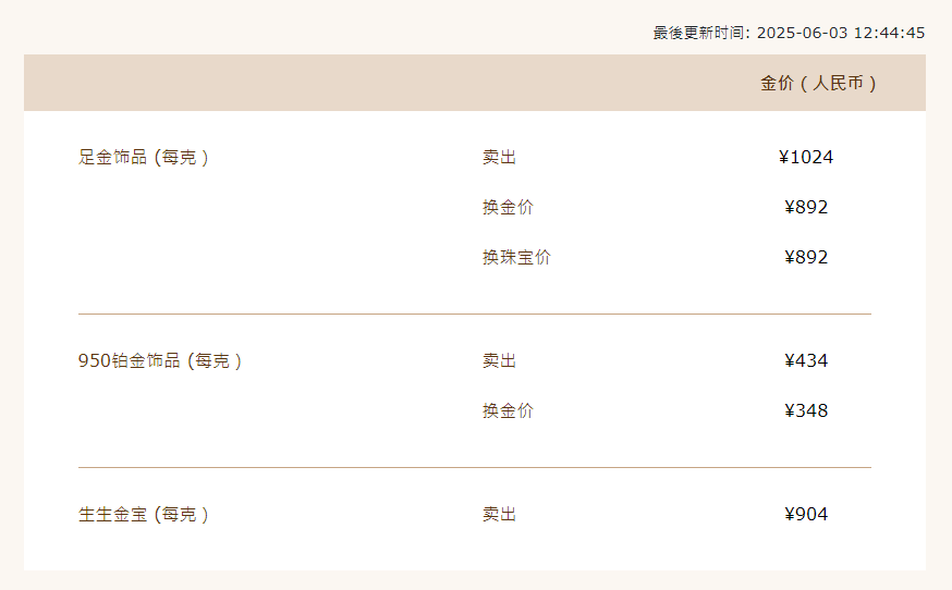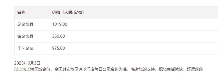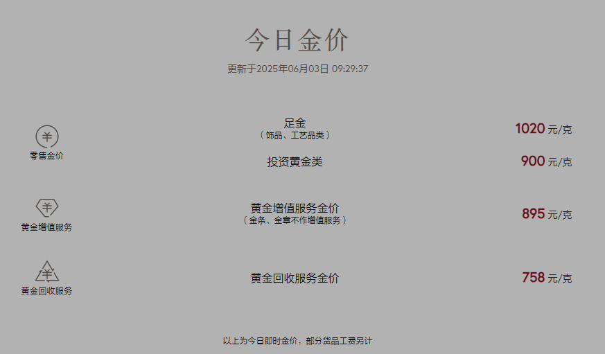 受国际金价上涨影响,6月3日,国内品牌金价纷纷跟涨。周大福足金饰品报价达到1020元/克,相比前一日998元/克上涨22元,涨幅显著。