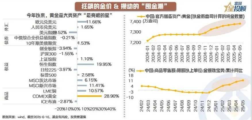 2025年以来,COMEX黄金上涨28.9%,在全球大类资产中表现突出。与此同时,“囤金潮”持续升温。一方面,全球央行积极购金,购金量连续三年超1000吨,中国央行自去年11月重启增持后,已连续7个月增加黄金储备。另一方面,“跟着央妈买黄金”成为流行口号,黄金珠宝零售额增速不断攀升,1-5月累计同比达12.3%。
