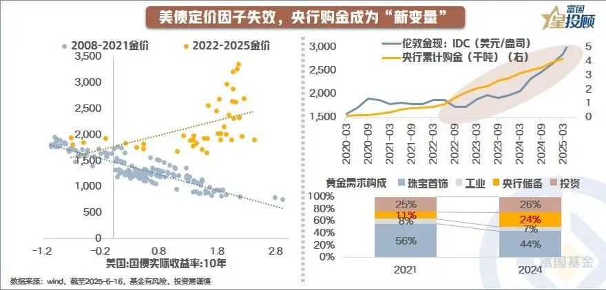 从黄金的传统定价框架看,核心锚是“美债利率”,但2022年以来,“美债利率”这个定价锚已失效,央行购金成为新的定价锚。不仅两者走势趋同,央行储备占比也从2021年底的11%提升至2024年底的24%。