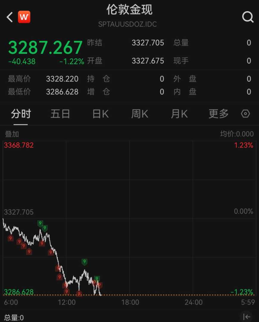Wind数据显示,截至15:18,伦敦金现货价格大幅下跌逾1%,至3287.267美元/盎司,最低更是触及3288.998美元/盎司;同时,COMEX黄金期货价格也跌至3300美元/盎司。这两大黄金价格指标均触及了近四周以来的新低点。