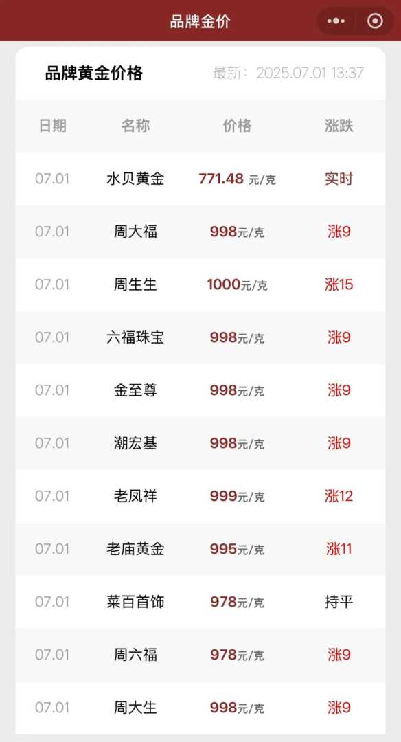 北京时间7月1日,中国商报记者注意到,国内金饰价格同步上调,部分品牌重新站上千元大关。