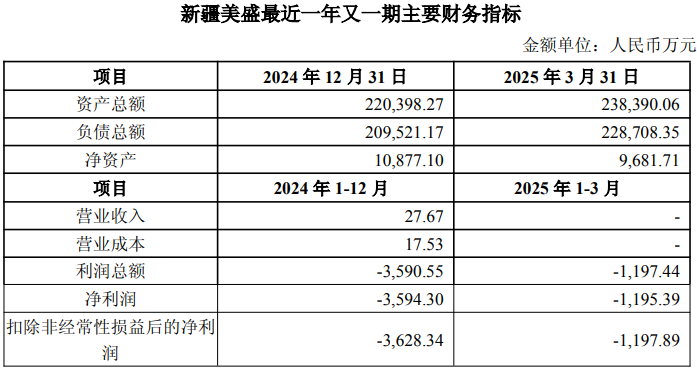 审计报告显示,新疆美盛2024年营收为27.67万元、净利润亏损3594.30万元。今年一季度,新疆美盛无营收,净利润亏损1195.39万元。