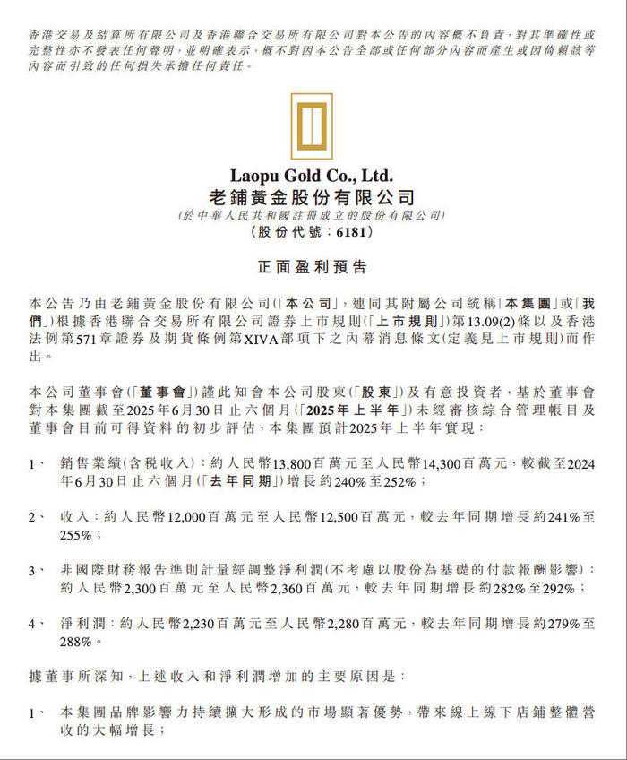 7月27日晚间,老铺黄金(HK06181)发布2025年中期业绩预告,预计上半年实现销售业绩(含税收入)约138亿元至143亿元,同比增长240%-252%;经调整净利润约23亿元至23.6亿元,同比增幅达282%-292%,刷新了公司历史纪录。