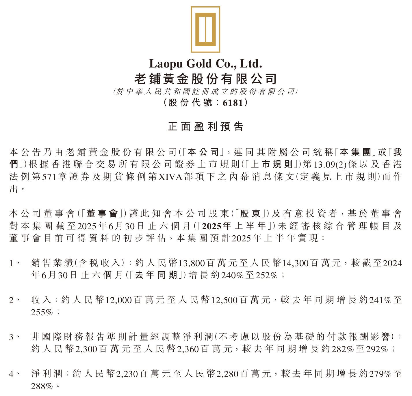 近日,老铺黄金股份有限公司(06181.HK)发布预盈公告,今年上半年销售业绩预计约138亿元至143亿元,同比增长约240%至252%;经调整净利润约23亿元至23.6亿元,同比增长约282%至292%。