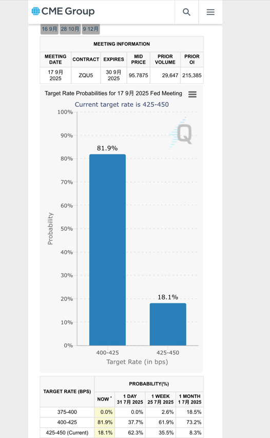 8月1日晚间,CME“美联储观察”数据显示,美联储9月降息概率升高。今年以来,现货黄金价格已累计上涨超27%,4月更创下3500美元/盎司的历史高位,黄金市场表现强劲。