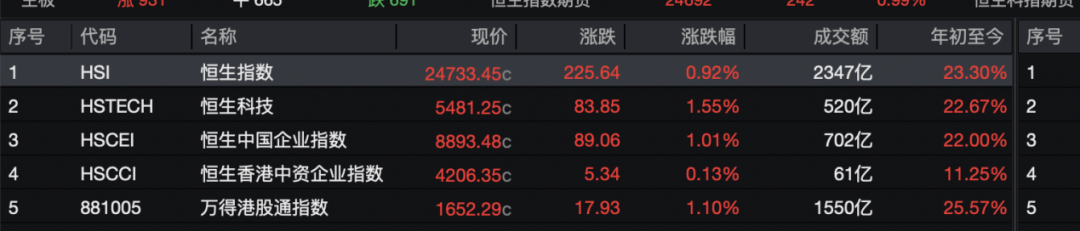 8月4日,港股三大指数集体上涨。截至收盘,恒生指数涨0.92%,报24733.45点;恒生科技指数涨1.55%;恒生中国企业指数涨1.01%。全日大市成交额为2347亿港元,南向资金罕见净流出180.92亿港元。今年以来截至8月1日,南向资金累计净流入港股8790.49亿港元。