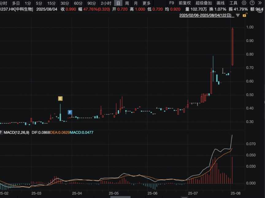 8月4日,中科生物涨幅达47.76%,报收于0.99港元/股。