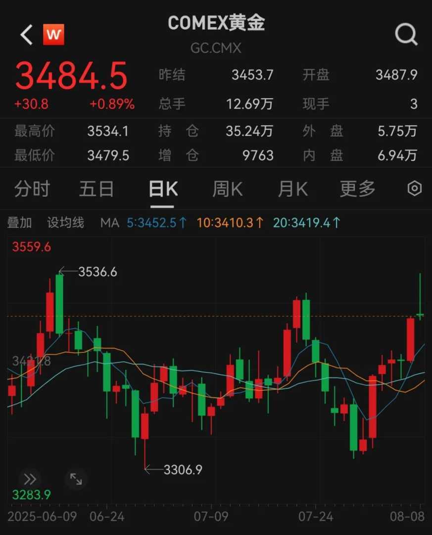 值得关注的是,8月8日金价出现大涨,一度升至历史高位。Wind数据显示,截至北京时间8月8日18点30分,COMEX(纽约商品交易所)黄金期货价报3484.5美元/盎司,当日盘中最高价一度至3534.1美元/盎司,达到历史高位。