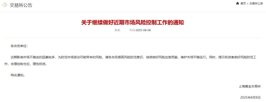 近一周以来,金价整体价格呈上升之势。按收盘价计,8月7日COMEX黄金期货价格较7月31日上涨超4%。上海黄金交易所于8月8日发布《关于继续做好近期市场风险控制工作的通知》称,近期影响市场不稳定的因素较多,为防范市场波动可能带来的风险,请各会员提高风险防范意识,继续做好风险应急预案,维护市场平稳运行。同时,提示投资者做好风险防范工作,合理控制仓位,理性投资。