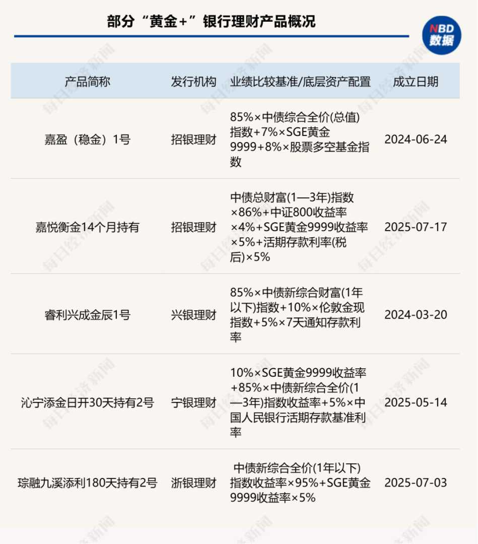 例如,招银理财发行的“招银理财招睿嘉盈(稳金)一年持有日开1号固收增强理财计划”,投资策略为“85%债券+7.5%黄金+7.5%量化中性”。银行理财普遍采用“固收+黄金”策略,部分推出挂钩黄金衍生品的结构化产品。