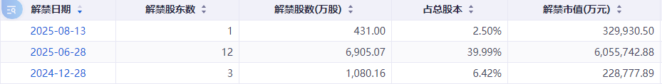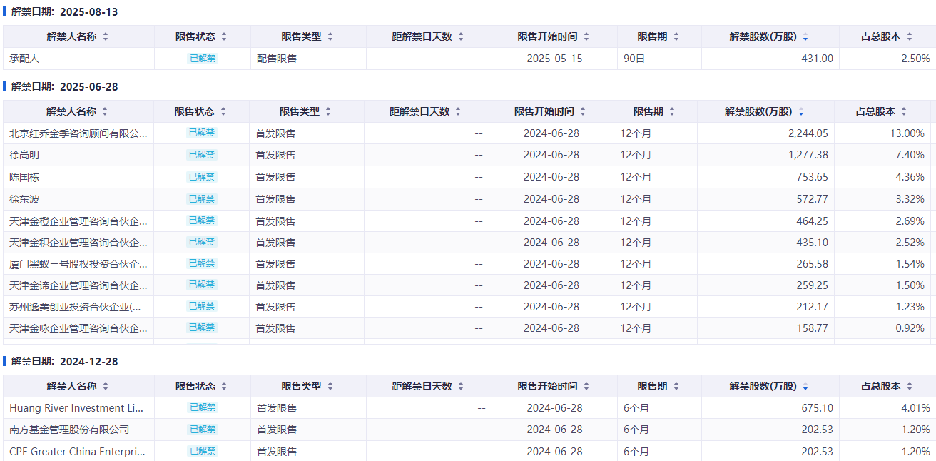而在此前的6月28日,老铺黄金已迎来最大规模解禁,涉及6905.07万股,占总股本的39.99%。此次解禁的股东包括董事长徐高明在内的12位主要股东,他们的持股均转为可自由交易状态。