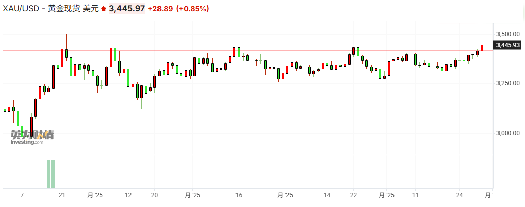美盘交易时段,现货黄金价格上涨0.85%,报每盎司3445美元,8月迄今涨幅高达4.7%。COMEX黄金期货涨逾1%,报3511美元/盎司,逼近历史最高水平,黄金市场热度持续攀升。