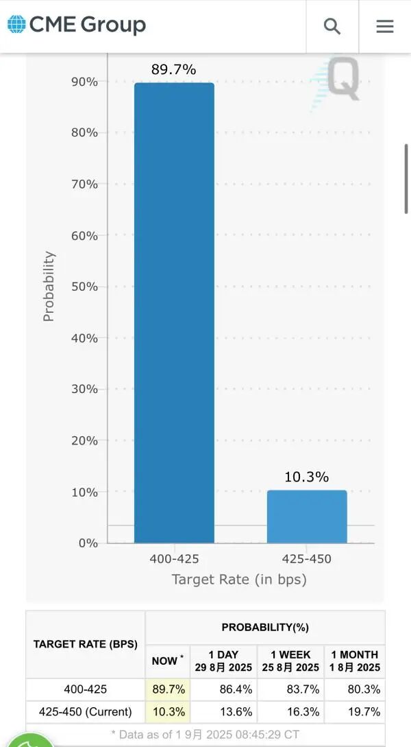 9月2日早间,CME“美联储观察”数据显示,美联储9月维持利率不变的概率下降至10.3%,降息25个基点的概率升高至89.7%,接近90%;美联储10月维持利率不变的概率仅为5%,累计降息25个基点的概率为49%;累计降息50个基点的概率为46%。黄金市场的未来走势,与美联储的货币政策息息相关。
