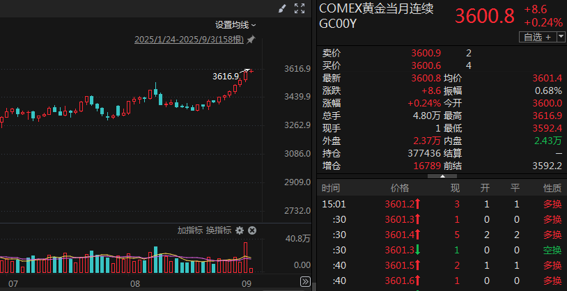 上证报中国证券网讯(记者朱妍)9月3日,截至记者发稿,COMEX黄金价格再度创出历史新高,盘中价格触及3616.9美元/盎司,其8月以来的涨幅已超7.5%,这一涨势吸引了全球投资者的目光。随着近期金价重拾涨势,多只黄金ETF的净值也创出新高,如永赢中证沪深港黄金产业股票ETF、国泰中证沪深港黄金产业股票ETF等,为投资者提供了分享黄金市场红利的途径。